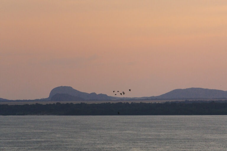Nous avons ensuite navigué sur la rivière Bita, considéré comme l’un des plus propres et les mieux conservés du pays, classé site Ramsar. C’est là que j’ai revu pour la deuxième fois l’Ouette de l’Orénoque (Oressochen jubatus), et que nous nous sommes baignés dans ses eaux cristallines. Sur le chemin du retour, nous avons profité d’un coucher de soleil magique sur un îlot de pierre pendant que Marc pêchait et que je photographiais.