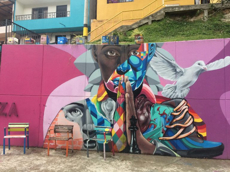 Bogota, ville en altitude en nuages et en ombres. Des montagnes masses sombres veillant sur la ville, des rues en pente aux murs éclairés bordés de graffitis, des tours de verres où le ciel se reflète où les vies s’empilent, des marchés vastes ordonnés, des places pleines d’attente remplies de pigeons et de passants. Des quartiers de briques rouges, de façades colorées. On y entend un vent vif qui descend des collines, des conversations précipitées, des musiciens une guitare un accordéon, une flûte andine…